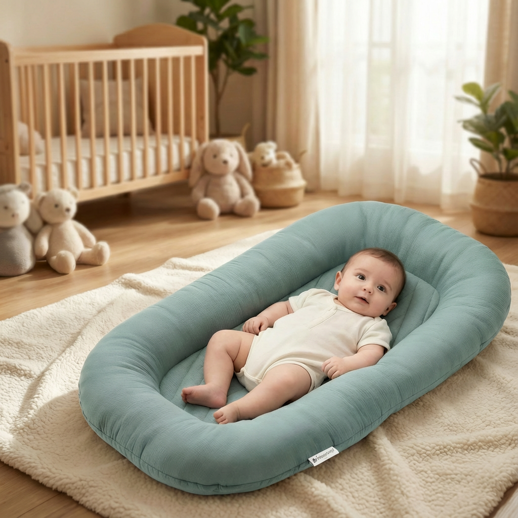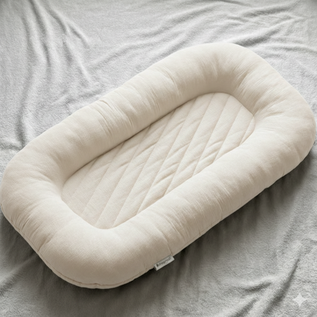 Babies are used to the snug, curved boundaries of the womb. Flat, open surfaces trigger the startle (Moro) reflex, which wakes and upsets them. Nuriva’s gentle raised sides recreate that womb-like feeling so your baby feels supported, not exposed — which helps them relax.