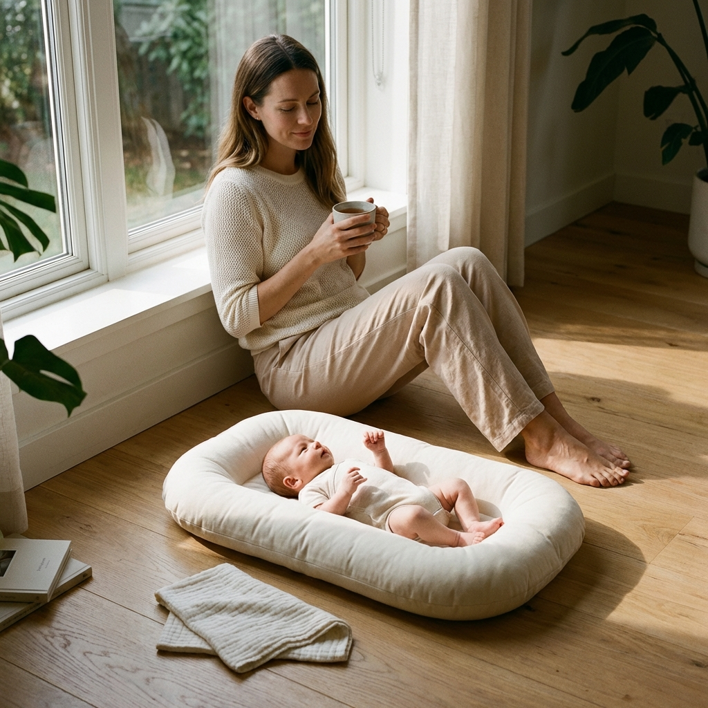 Nuriva™ gives your baby the snug, womb-like feeling they miss — without breaking modern safety rules. With a firm, flat base, low breathable sides, and organic, washable fabric, it’s built for supervised awake time so your baby can relax… while you finally drink a hot coffee.